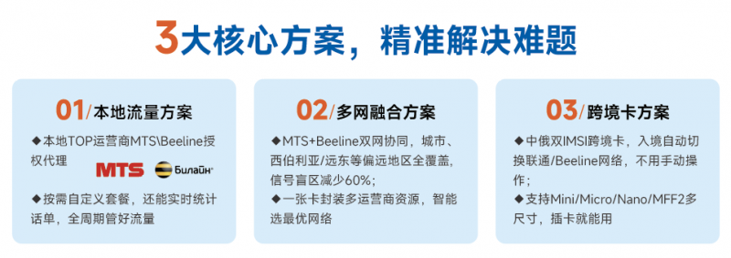 本地流量方案:依托与俄罗斯主流运营商MTS、Beeline的直连资源,提供灵活套餐与实时话单管理,助力企业实现流量成本精准控制;