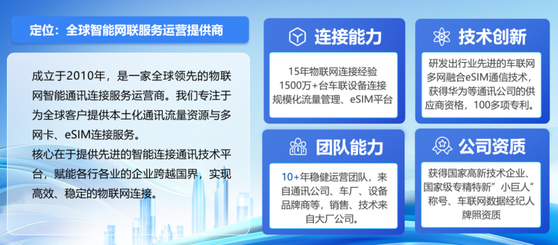 翼卡车联网(ECARTELEMATICS)成立于2010年,是一家全球领先的物联网智能通讯连接服务运营商。公司拥有15年物联网连接经验,累计服务超1500万台车联设备,具备规模化流量管理与eSIM平台能力;在技术层面,自主研发多网融合eSIM通信技术,持有百余项专利,并已获得国家高新技术企业、专精特新“小巨人”等权威资质。其核心团队拥有通讯、车厂、设备等领域背景,具备10年以上稳健运营经验,为出海企业提供从资源、技术到合规的全链路支撑。